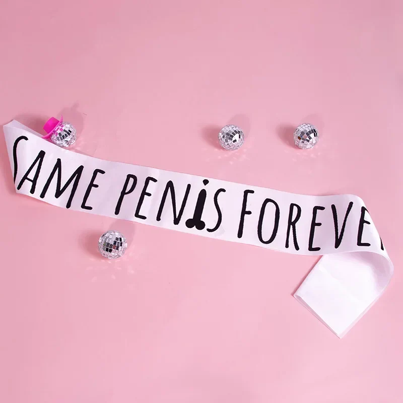A little naughty, very bride. This Same Penis Forever bride sash hat with veil is a cheeky hen party accessory made for laughs, photos, and unforgettable bachelorette moments. Featuring the bold slogan on the front and a soft veil detail at the back, it’s the ultimate statement piece for brides who love classic hen party humour.